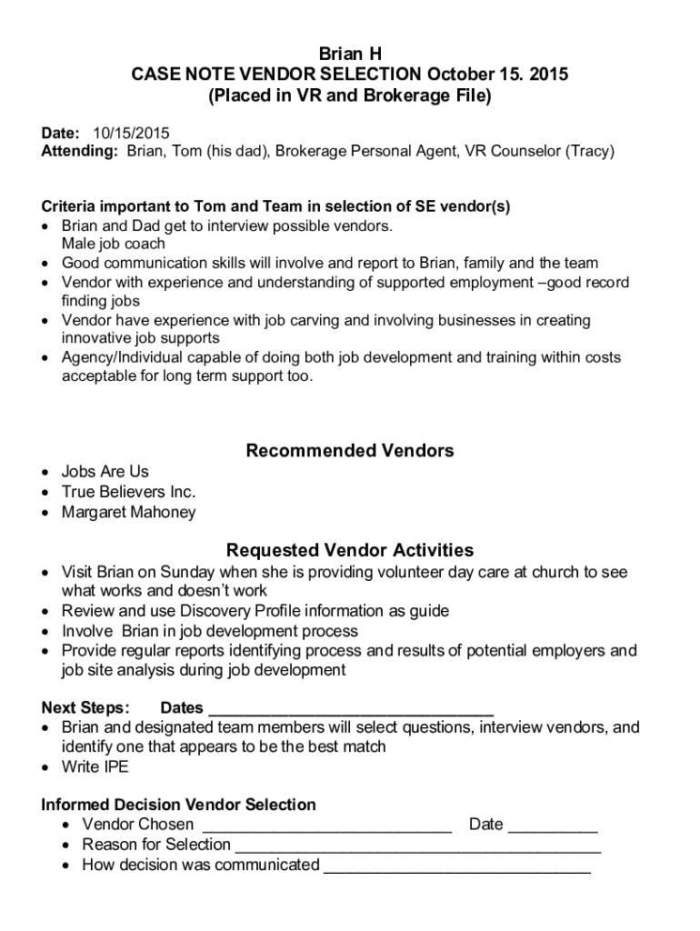 Get the free Brian H CASE NOTE VENDOR SELECTION October 15. 2015 ...