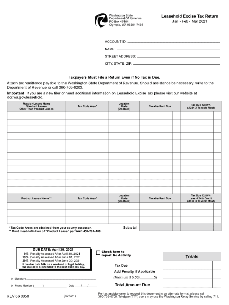 Leasehold Excise Tax Return Washington State Department Of Revenue PO Box 47464 Olympia, WA 985047464Jan Feb Mar 2021ACCOUNT ID: NAME: STREET ADDRESS: CITY, STATE, ZIP:Taxpayers Must File a Return