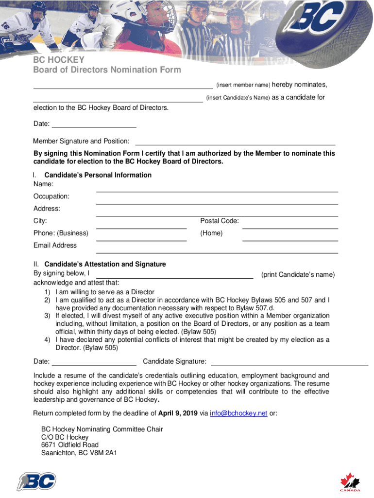 (insert Candidates Name) as nominates, a candidate for election to the BC Hockey Board of Directors.