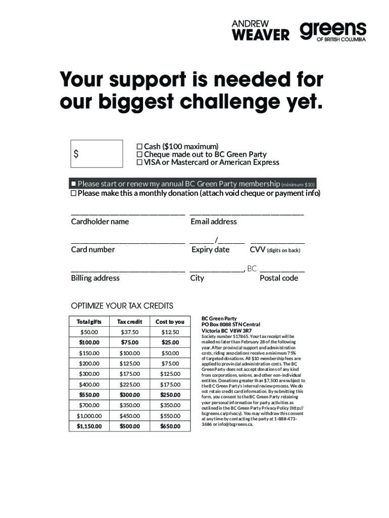 Your support is needed for our biggest challenge yet. Cash ($100 maximum) Check made out to BC Green Party VISA or Mastercard or American Express$Please start or renew my annual BC Green Party membership