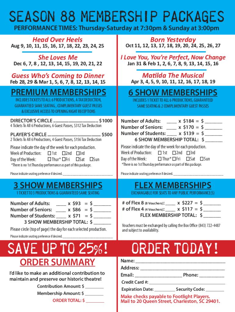 Season 88 MEMBERSHIP PACKAGES PERFORMANCE TIMES: Thursday Saturday at 7:30pm & Sunday at 3:00pmHead Over Heels Born Yesterday Aug 9, 10, 11, 15, 16, 17, 18, 22, 23, 24, 25Oct 11, 12, 13, 17, 18, 19,
