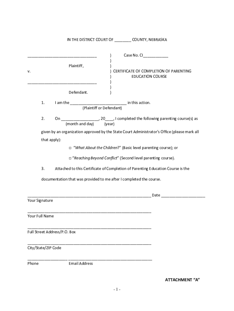 IN THE DISTRICT COURT OF COUNTY, NEBRASKA Plaintiff, v. Defendant.) Case No. CI))) CERTIFICATE OF COMPLETION OF PARENTING) EDUCATION COURSE)))1. I am the in this action. (Plaintiff or Defendant)2.