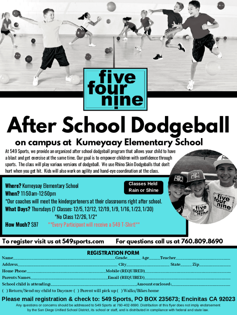 on campus at Kumeyaay Elementary School At 549 Sports, we provide an organized after school dodgeball program that allows your child to have