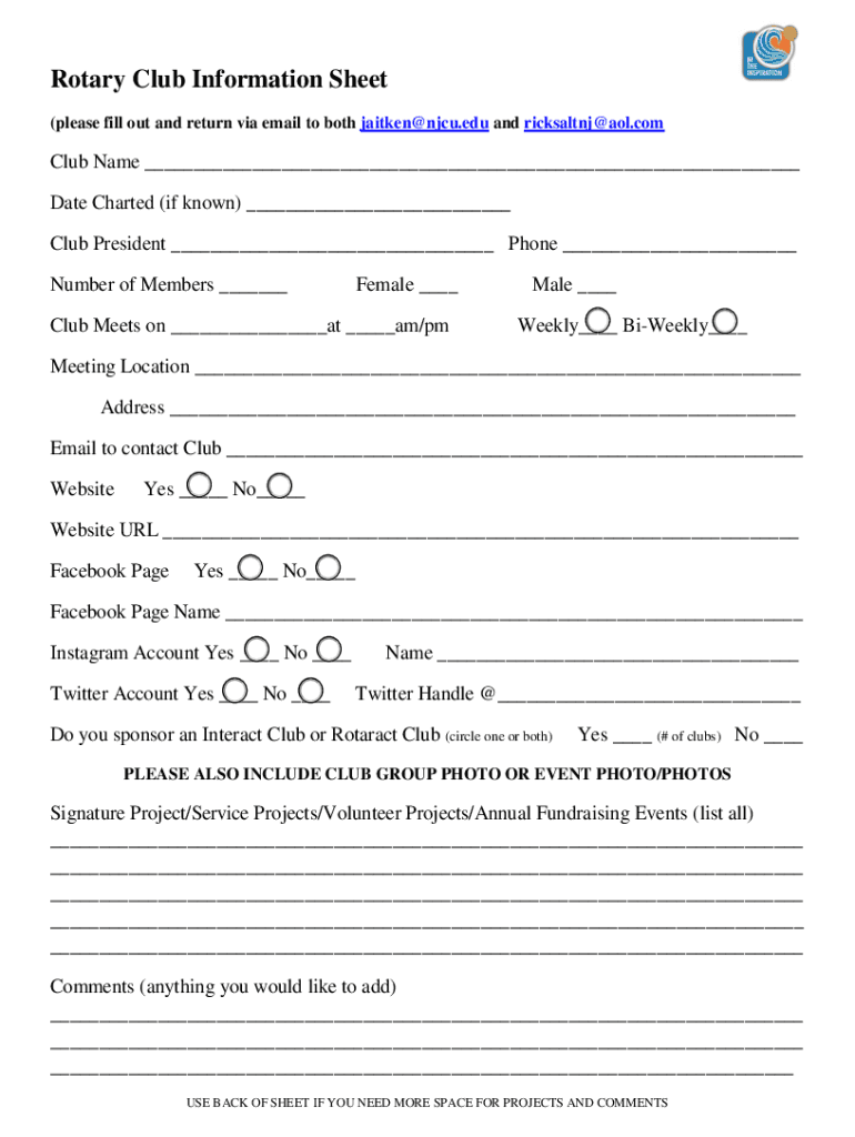 Rotary Club Information Sheet (please fill out and return via email to both Aiken NBCU.edu and ricksaltnj AOL.club Name Date Charted (if known) Club President Phone Number of Members Female Club Meets