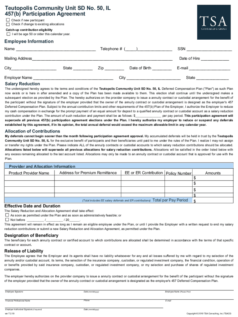 Metropolis Community Unit SD No. 50, IL 457(b) Participation Agreement Check if new participant Check if change to existing allocations Catch up contribution eligibility I will be age 50 or older