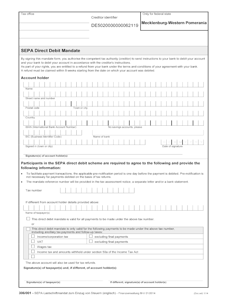Form print Delete entries Tax office Only for federal state Creditor identifier DE5020000000062119 Mecklenburg-Western Pomerania SEPA Direct Debit Mandate By signing this mandate form, you authorize