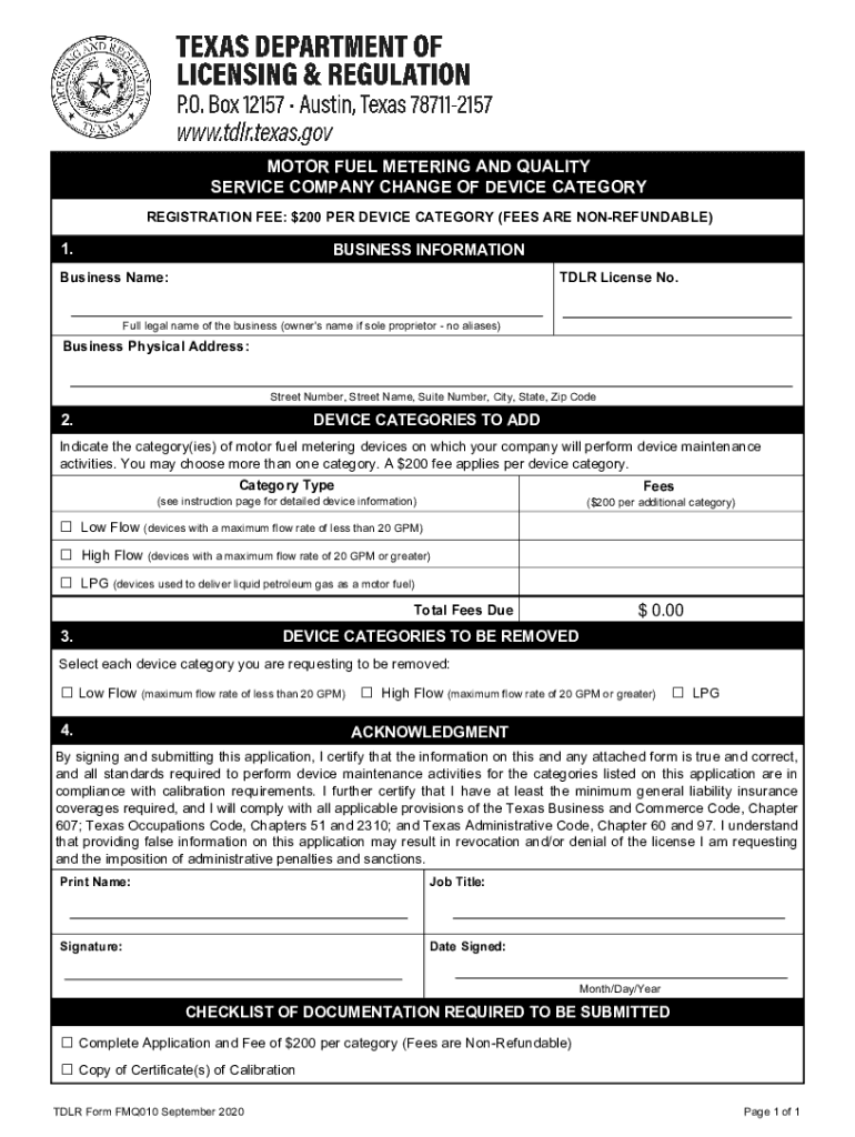 MOTOR FUEL METERING AND QUALITY SERVICE COMPANY CHANGE OF DEVICE CATEGORY INSTRUCTIONS KEEP A COPY OF YOUR COMPLETED APPLICATION, ALL ATTACHMENTS, AND YOUR CHECK OR MONEY ORDER PAYABLE TO DLR. 1.