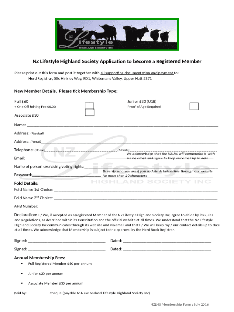NZ Lifestyle Highland Society Application to become a Registered Member Please print out this form and post it together with all supporting documentation and payment to: Herd Registrar, 50c Hinkley