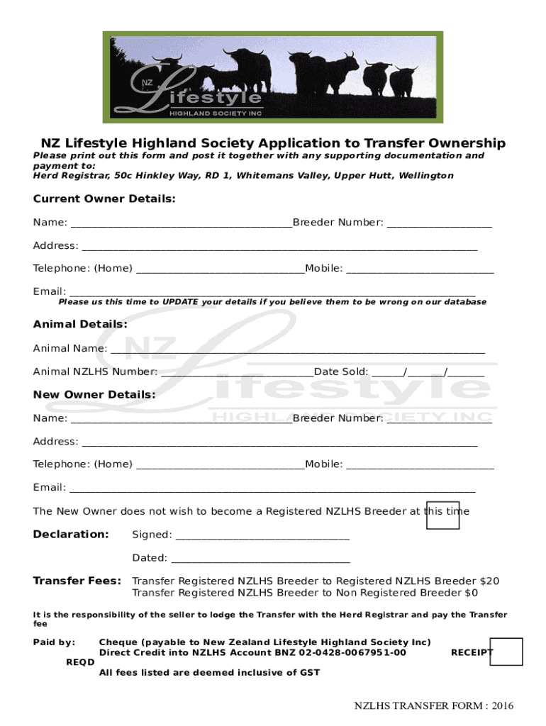 NZ Lifestyle Highland Society Application to Transfer Ownership Please print out this form and post it together with any supporting documentation and payment to: Herd Registrar, 50c Hinkley Way, RD