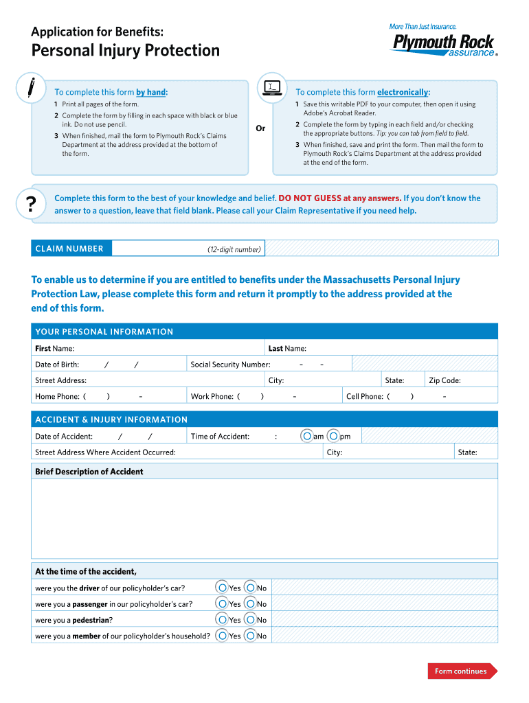 Once the Application for Benefits is completed and notarized if necessary, it must be submitted to Plymouth Rock’s Claims Department. There are several methods available for submission: