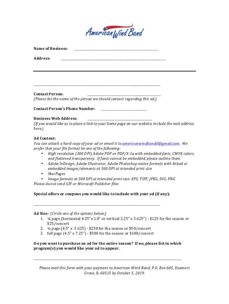 Name of Business: Address: Contact Person: (Please list the name of the person we should contact regarding this ad.) Contact Persons Phone Number: Business Web Address: (If you would like us to place