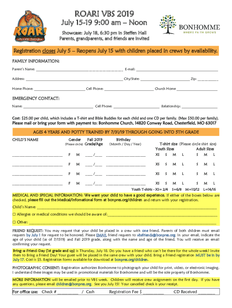 ROAR! VBS 2019July 1519 9:00 am Noon Showcase: July 18, 6:30 pm in Steffen Hall Parents, grandparents, and friends are invitedRegistration closes July 5 Reopens July 15 with children placed in crews