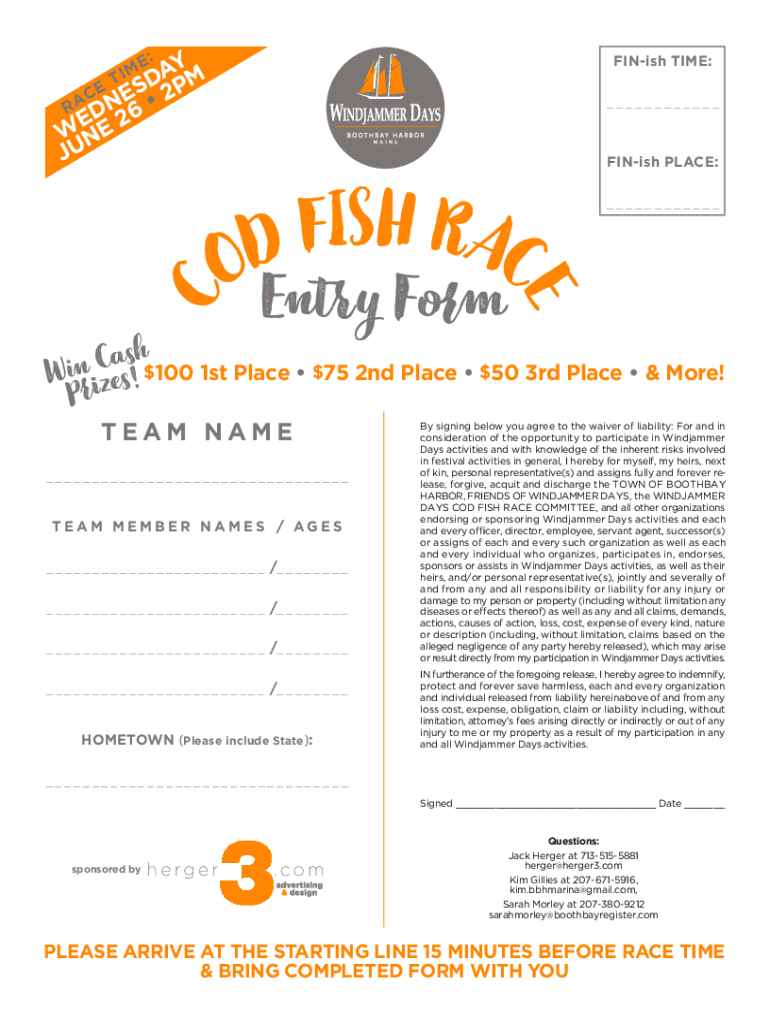 E: M IN A T E ESD 2PM C R A DN 6 E 2 W NE Finish TIME: Finish PLACE: Entry FormCash$100 1st Place $75 2nd Place $50 3rd Place & More! N i W sizes ! Team NAME TEAM MEMBER NAMES / AGES / / / / HOMETOWN