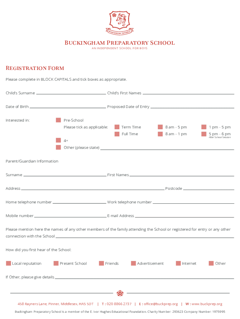 Buckingham Preparatory School AN INDEX PE ND E NT SC HO O L F O R BO Registration Form Please complete in BLOCK CAPITALS and tick boxes as appropriate. Child's SurnameChilds First Namesake of BirthProposed