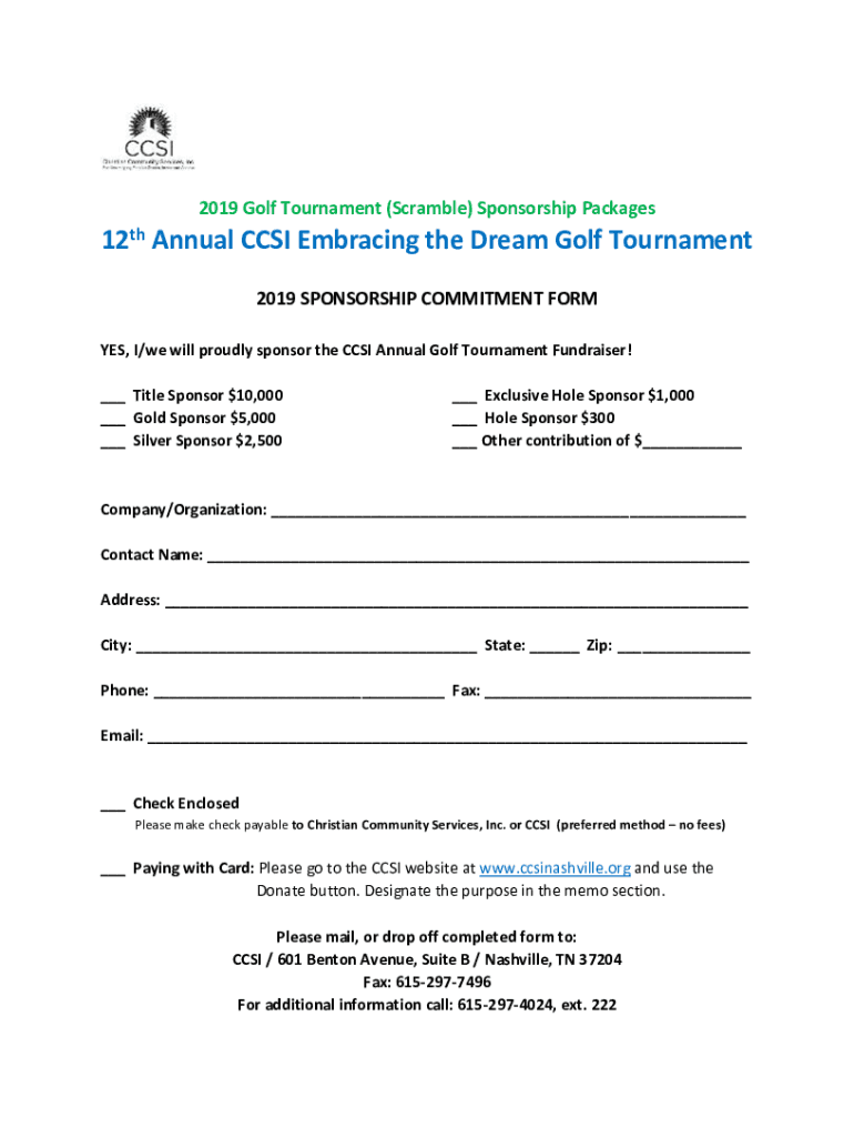 2019 Golf Tournament (Scramble) Sponsorship Packages12th Annual CSI Embracing the Dream Golf Tournament 2019 SPONSORSHIP COMMITMENT FORM YES, I/we will proudly sponsor the CSI Annual Golf Tournament