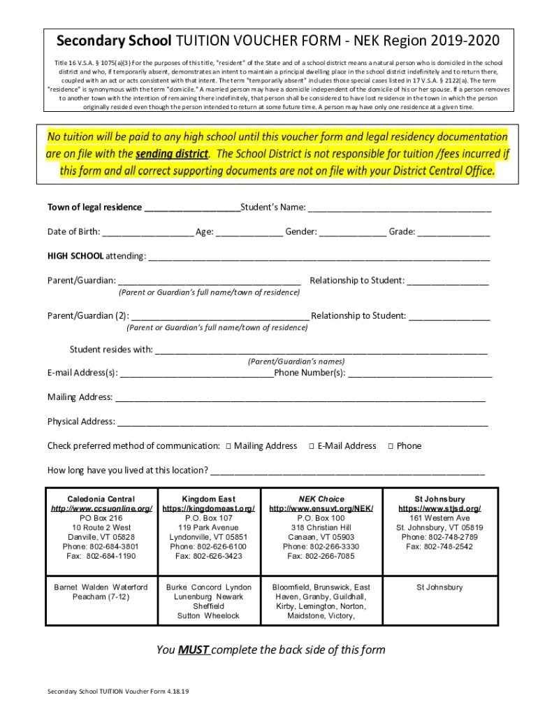 Secondary School TUITION VOUCHER FORM NEW Region 20192020 Title 16 V.S.A. 1075(a)(3) For the purposes of this title, “resident of the State and of a school district means a natural person who is