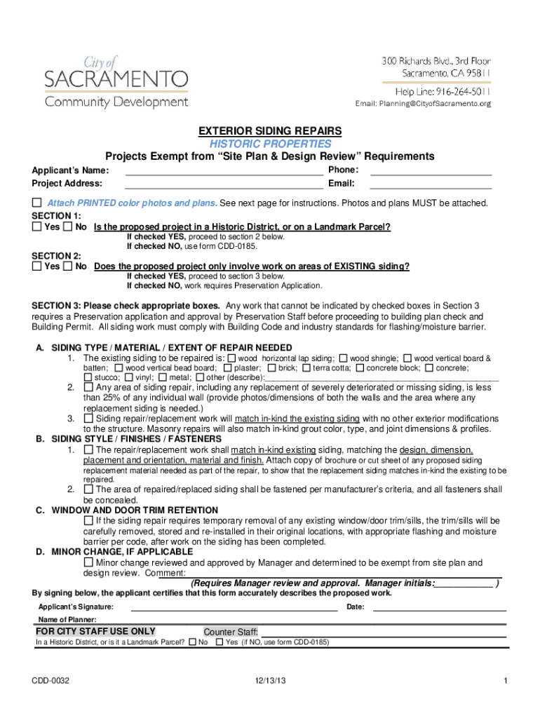 EXTERIOR SIDING REPAIRS HISTORIC PROPERTIES Projects Exempt from Site Plan & Design Review Requirements Phone: Email:Applicants Name: Project Address:Attach PRINTED color photos and plans. See next