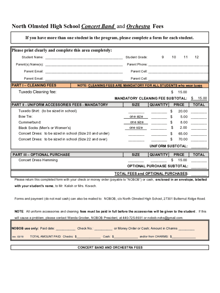 North Olmsted High School Concert Band and Orchestra Fees If you have more than one student in the program, please complete a form for each student. Please print clearly and complete this area completely: