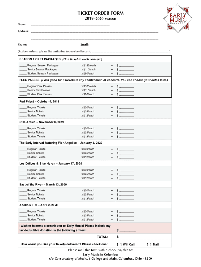 TICKET ORDER FORM 20192020 Seasonal: Address: Phone: Email: (Active students, please list institution to receive discount:) SEASON TICKET PACKAGES (One ticket to each concert.) Regular Season Packages
