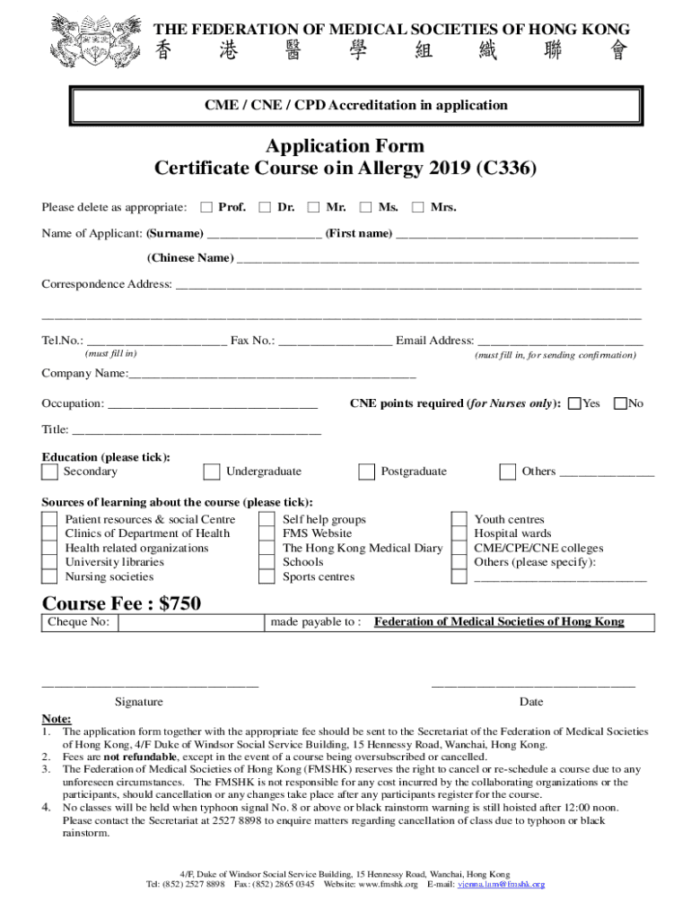 THE FEDERATION OF MEDICAL SOCIETIES OF HONG ONCE / CNE / CPD Accreditation in applicationApplication Form Certificate Course o in Allergy 2019 (C336) Please delete as appropriate: Prof. Dr. Mr. Ms.