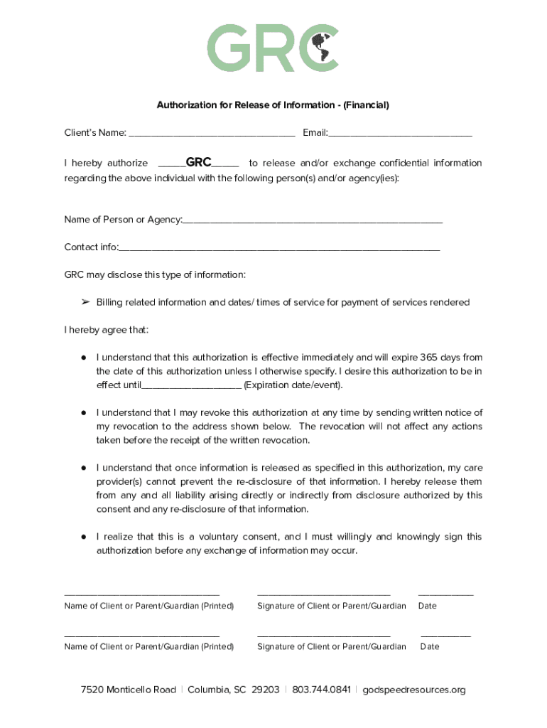 Authorization for Release of Information (Financial) Clients Name: Email: I hereby authorize GRC to release and/or exchange confidential information regarding the above individual with the following