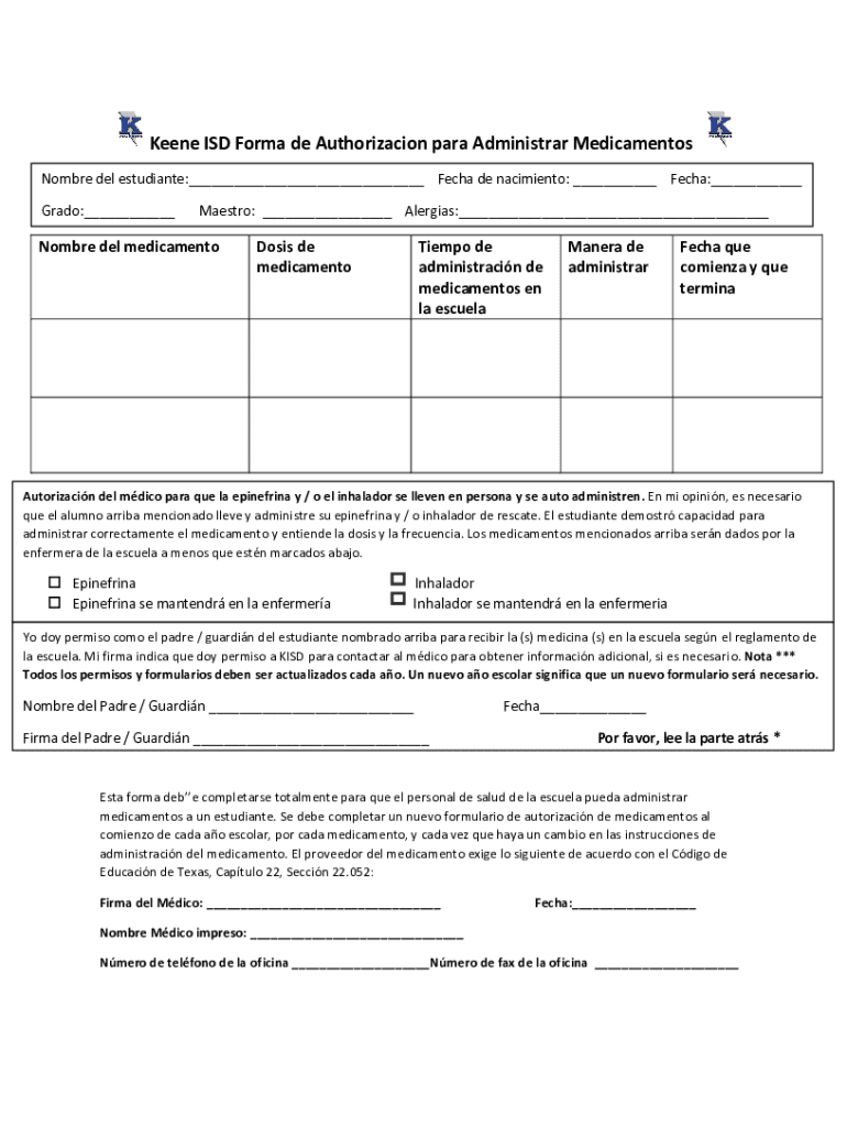 Keen ISD Form de Authorizacion para Administrator Medicament Hombre Del estudiante: Tech de Nascimento: Tech: Grade: Maestro: Allergies: Hombre Del medicamentoDosis de medicamentoTiempo de administration