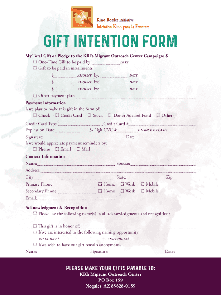 My Total Gift or Pledge to the KBS Migrant Outreach Center Campaign: $DATEOneTime Gift to be paid by:Gift to be paid in installments: