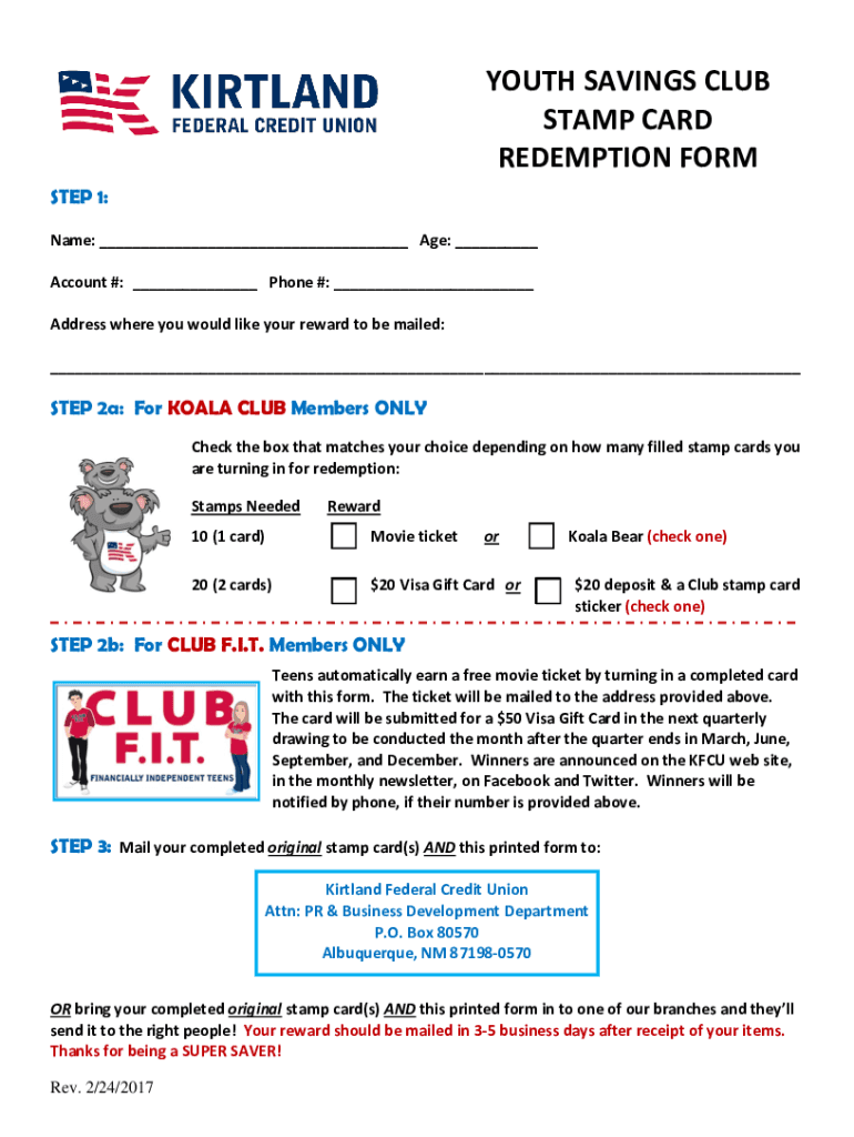 KIRTLAND FEDERALCREDITUNIONYOUTH SAVINGS CLUB STAMP CARD REDEMPTION FORMS TEP 1: Name: Age: Account #: Phone #: Address where you would like your reward to be mailed: STEP 2a: For KOALA CLUB Members