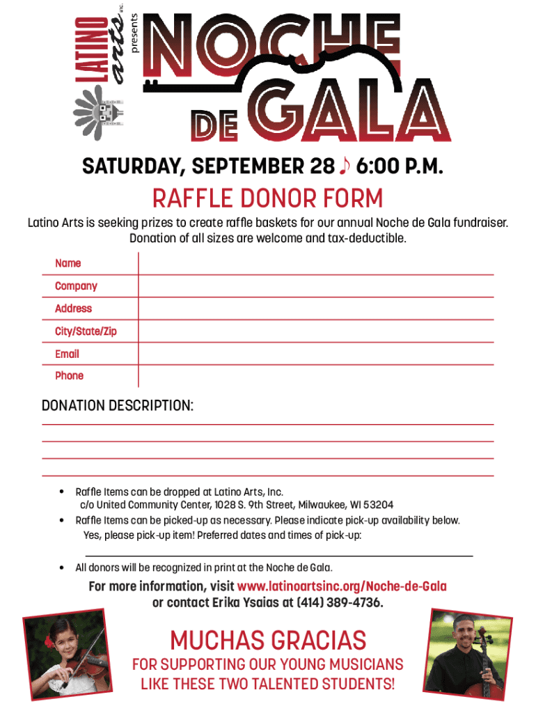 SATURDAY, SEPTEMBER 28 6:00 P.M.RAFFLE DONOR FORM Latino Arts is seeking prizes to create raffle baskets for our annual Niche de Gala fundraiser.