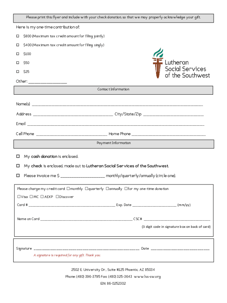 Please print this flyer and include with your check donation, so that we may properly acknowledge your gift. Here is my onetime contribution of: $800 (Maximum tax credit amount for filing jointly)$400