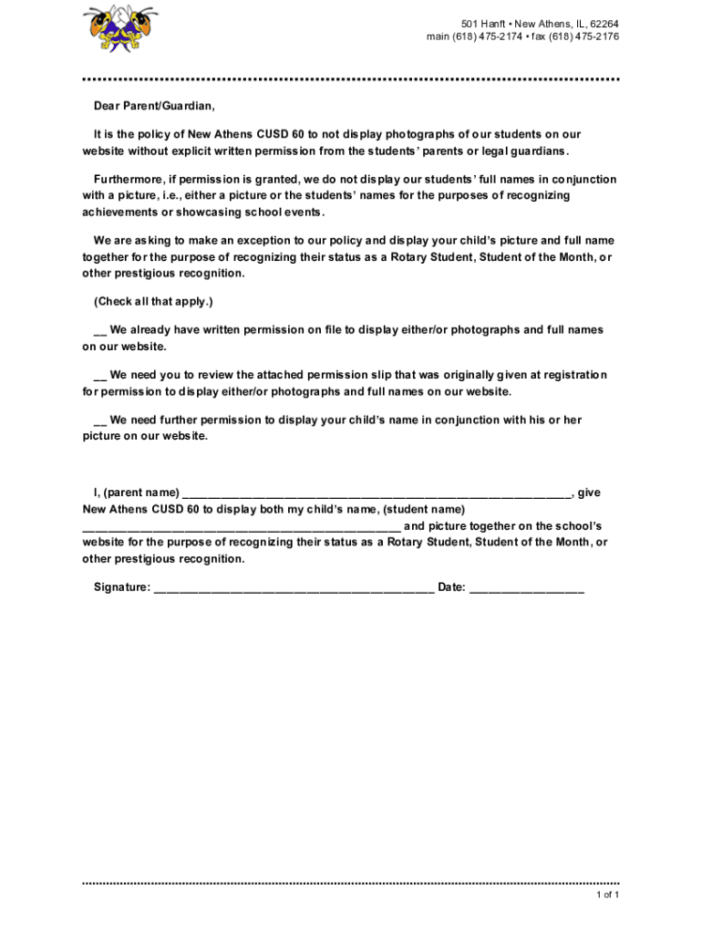501 Haft New Athens, IL, 62264 main (618) 4752174 fax (618) 4752176Dear Parent/Guardian, It is the policy of New Athens CUSP 60 to not display photographs of our students on our website without explicit