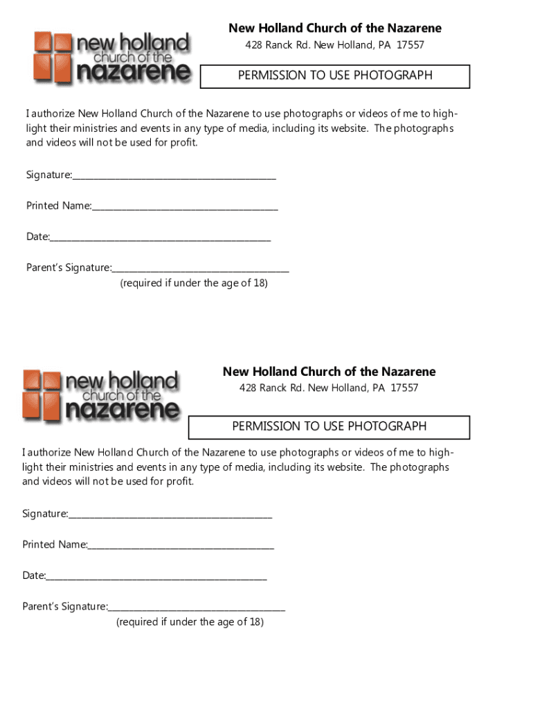 New Holland Church of the Nazarene 428 Rank Rd. New Holland, PA 17557PERMISSION TO USE PHOTOGRAPH I authorize New Holland Church of the Nazarene to use photographs or videos of me to highlight their