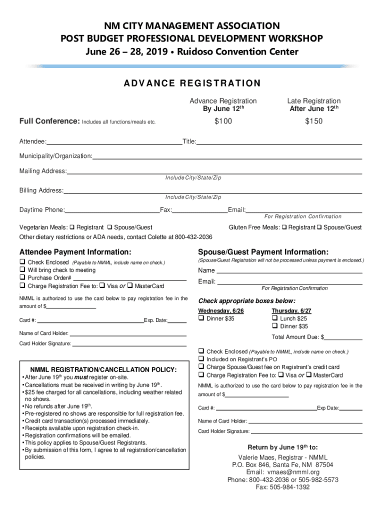NM CITY MANAGEMENT ASSOCIATION POST BUDGET PROFESSIONAL DEVELOPMENT WORKSHOP June 26 28, 2019 Voodoo Convention Center AD VANCE REGISTRATION Advance Registration By June 12thLate Registration After