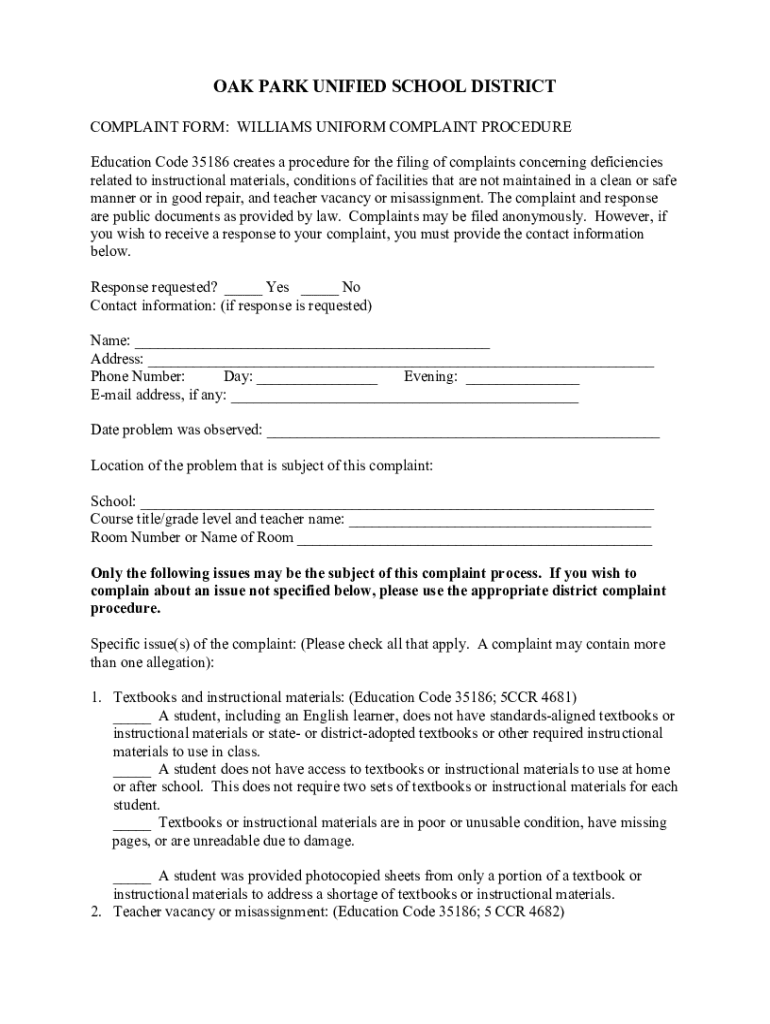 Get the free WILLIAMS UNIFORM COMPLAINT FORM Education Code ...