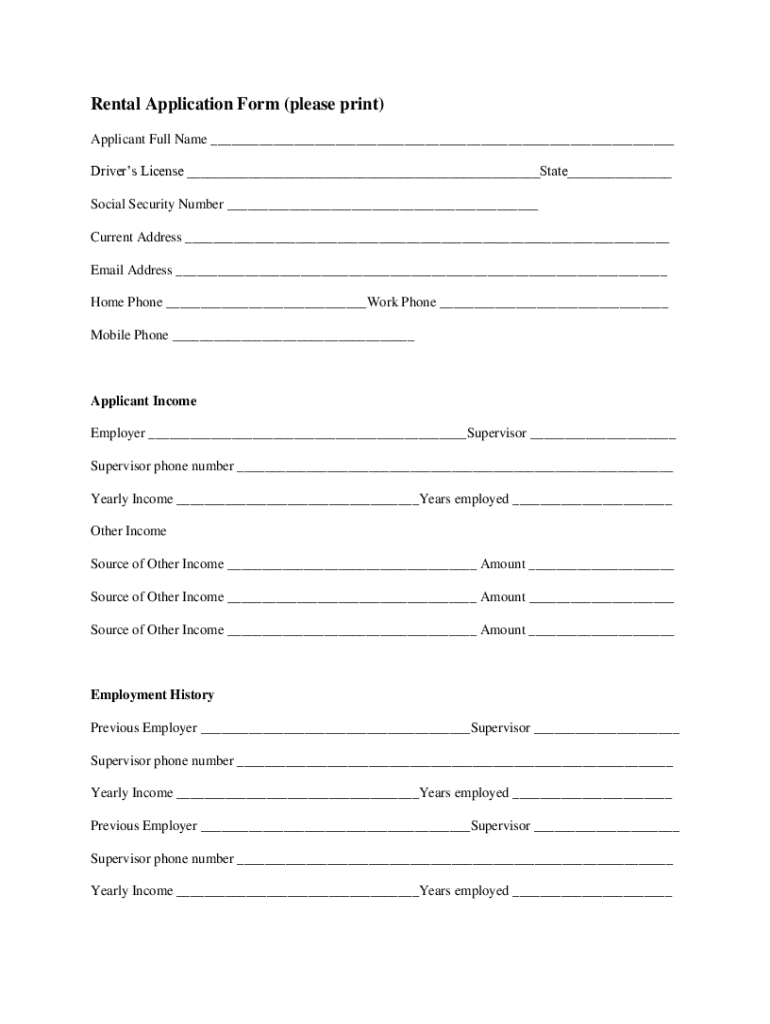 Rental Application Form (please print) Applicant Full Name Driver's License State Social Security Number Current Address Email Address Home Phone Work Phone Mobile Phone Applicant Income Employer