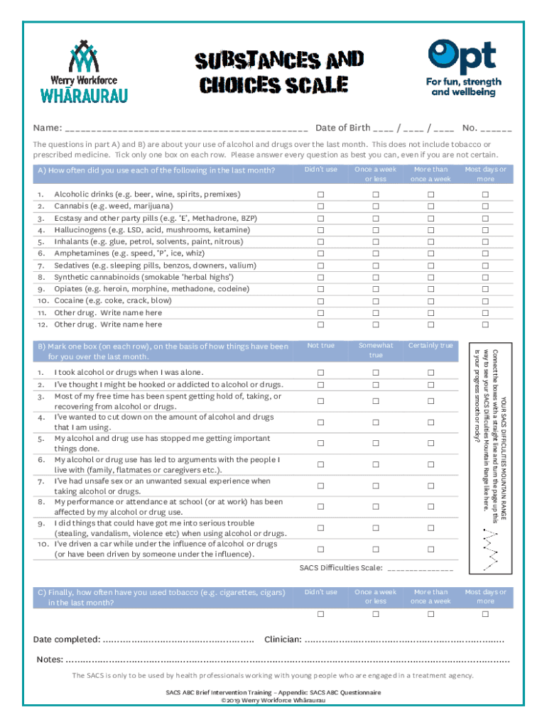 Name: Date of Birth / / No. The questions in part A) and B) are about your use of alcohol and drugs over the last month. This does not include tobacco or prescribed medicine. Tick only one box on