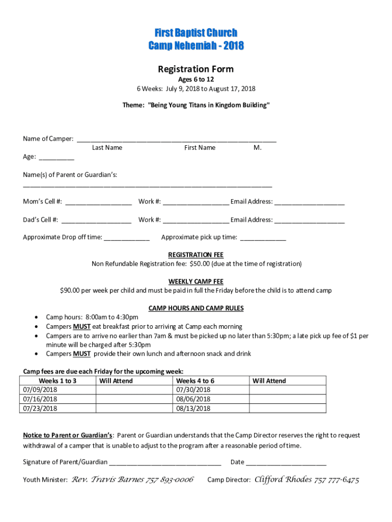 First Baptist Church Camp Nehemiah 2018 Registration Form Ages 6 to 12 6 Weeks: July 9, 2018, to August 17, 2018, Theme: “Being Young Titans in Kingdom Building “Name of Camper: Last Name First