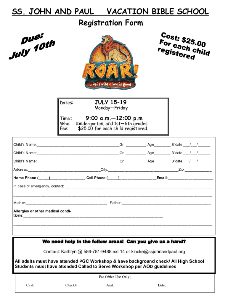 SS. JOHN AND PAUL VACATION BIBLE SCHOOL Registration Formats:JULY 1519MondayFridayTime: 9:00 a.m.12:00 p.m. Who: Kindergarten, and 1st6th grades Fee: $25.00 for each child registered. Child's Name: