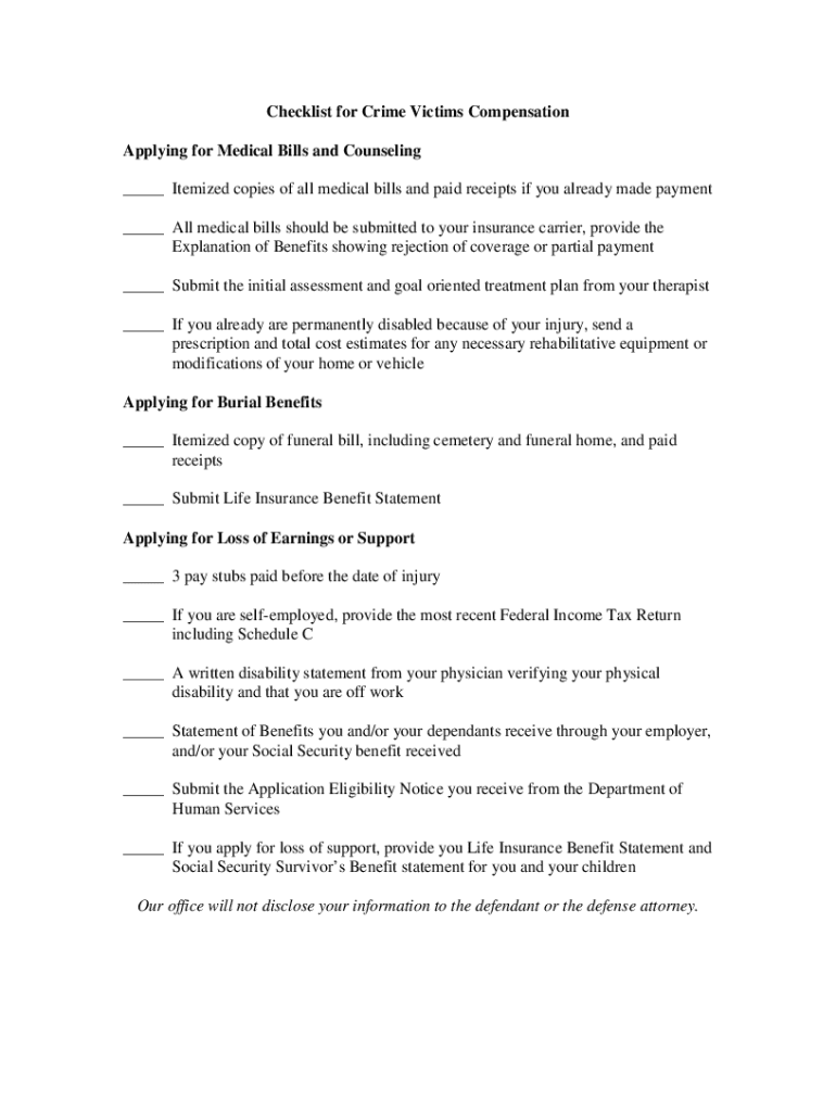 Checklist for Crime Victims Compensation Applying for Medical Bills and Counseling Itemized copies of all medical bills and paid receipts if you already made payment All medical bills should be submitted