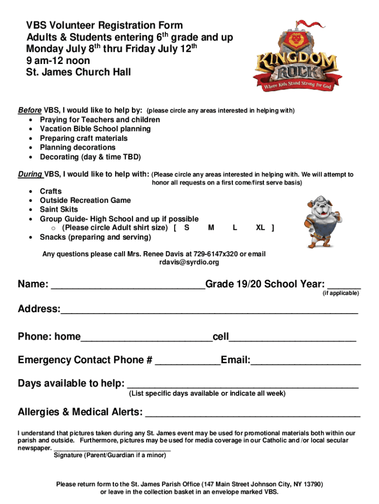VBS Volunteer Registration Form Adults & Students entering 6th grade and up Monday, July 8th through Friday, July 12th 9 am12 noon St. James Church Hellebore VBS, I would like to help by: (please