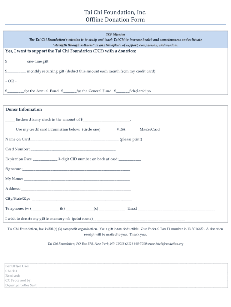 Tai Chi Foundation, Inc. Offline Donation Form TCF Mission The Tai Chi Foundations mission is to study and teach Tai Chi to increase health and consciousness and cultivate strength through softness