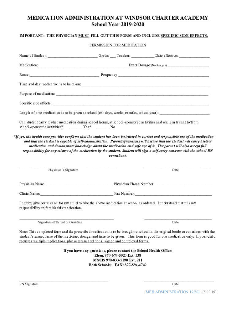 MEDICATION ADMINISTRATION AT WINDSOR CHARTER ACADEMY School Year 20192020 IMPORTANT: THE PHYSICIAN MUST FILL OUT THIS FORM AND INCLUDE SPECIFIC SIDE EFFECTS. PERMISSION FOR MEDICATION Name of Student: