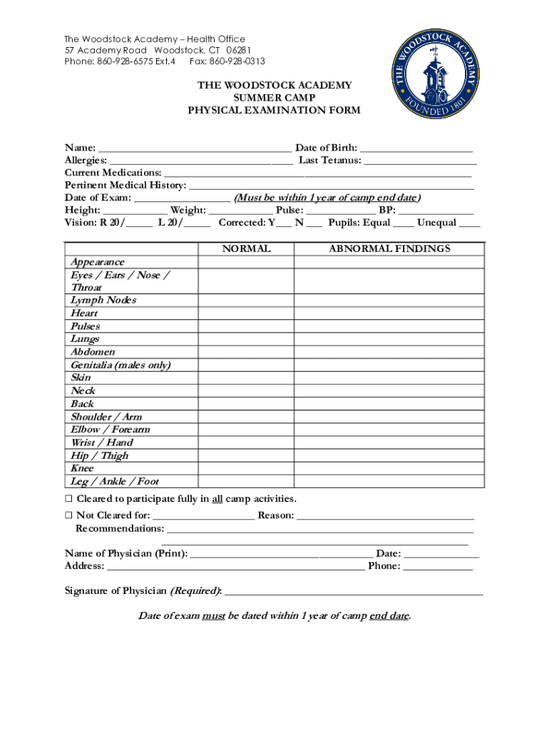 The Woodstock Academy Health Office 57 Academy Road Woodstock, CT 06281 Phone: 8609286575 Ext.4 Fax: 8609280313THE WOODSTOCK ACADEMY SUMMER CAMP PHYSICAL EXAMINATION FORM Name: Date of Birth: Allergies: