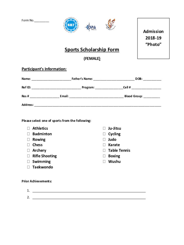Form No. Sports Scholarship Readmission 201819 Photo(FEMALE) Participants Information: Name: Fathers Name: DOB: Ref ID: Program: Cell # Res # Email: Blood Group: Address: Please select one of sports