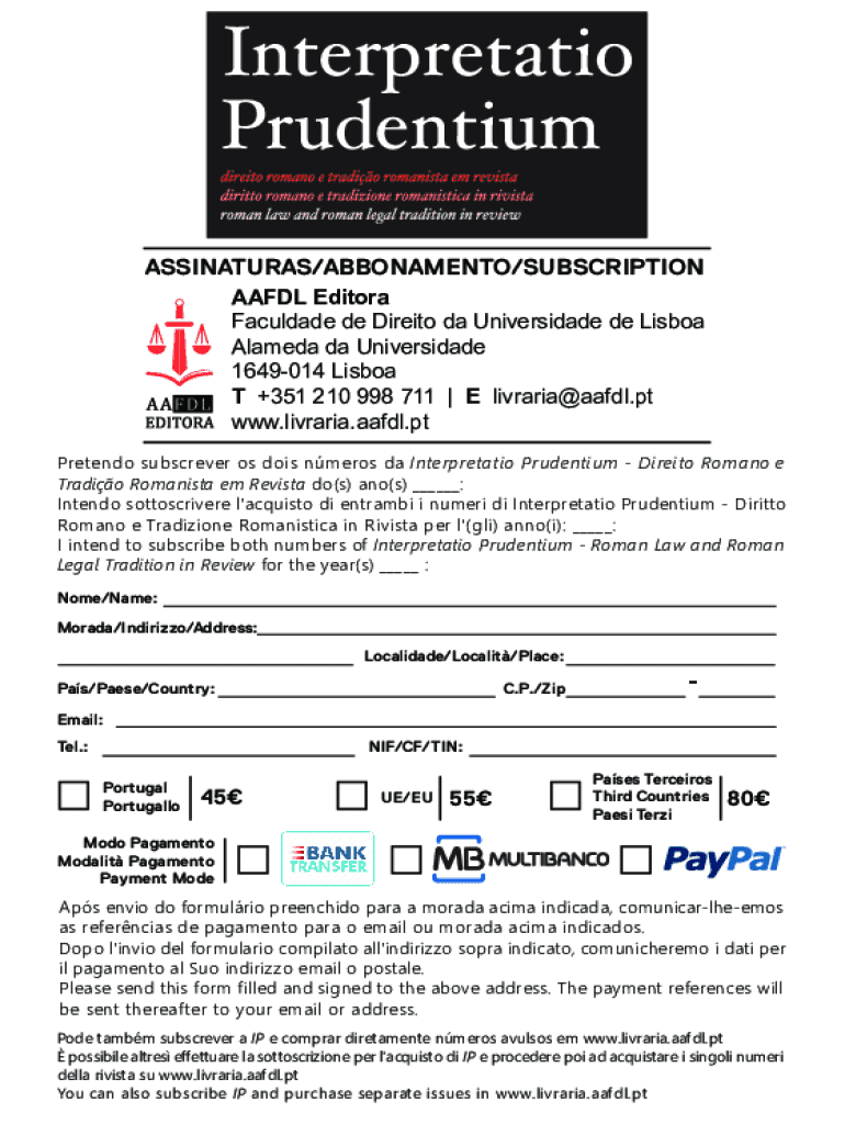 ASSINATURAS/ABBONAMENTO/SUBSCRIPTION AAF DL Editor Facade de Direito the Universidade de Lisboa Alameda the Universidade 1649014 Lisbon T +351 210 998 711 E librarian awful.pt www.livraria.aafdl.pt