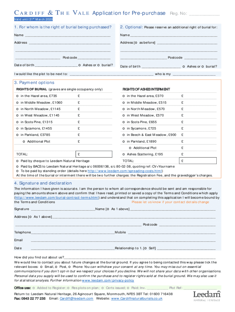 Cardiff & The Vale Application for Prepurchase Valid until31stReg. No: March 20201. For whom is the right of burial being purchased?2. Optional: Please reserve an additional right of burial for:Name