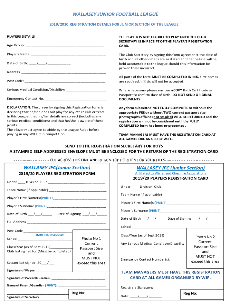WALLACE JUNIOR FOOTBALL LEAGUE 2019/2020 REGISTRATION DETAILS FOR JUNIOR SECTION OF THE LEAGUE PLAYERS DETAILS Age Group: Players Name: Date of Birth: / / THE PLAYER IS NOT ELIGIBLE TO PLAY UNTIL