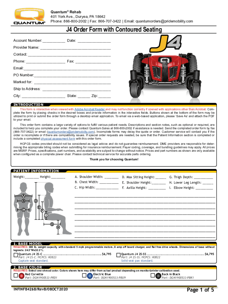 Quantum Rehab 401 York Ave., Dryer, PA 18642 Phone: 8668002002 Fax: 8667073422 Email: quantum orders pride mobility.comJ4 Order Form with Contoured Seating Account Number: Date: Provider Name: Contact: