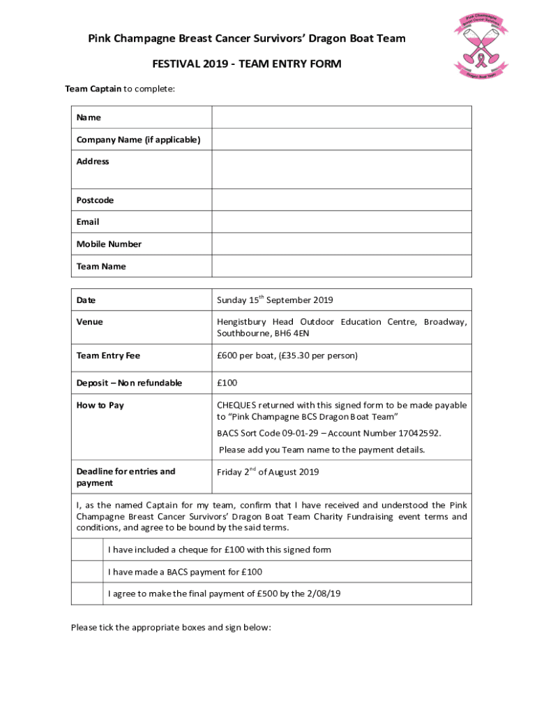 Pink Champagne Breast Cancer Survivors Dragon Boat Team FESTIVAL 2019 TEAM ENTRY FORM Team Captain to complete: Name Company Name (if applicable) AddressPostcode Email Mobile Number Team NameDateSunday