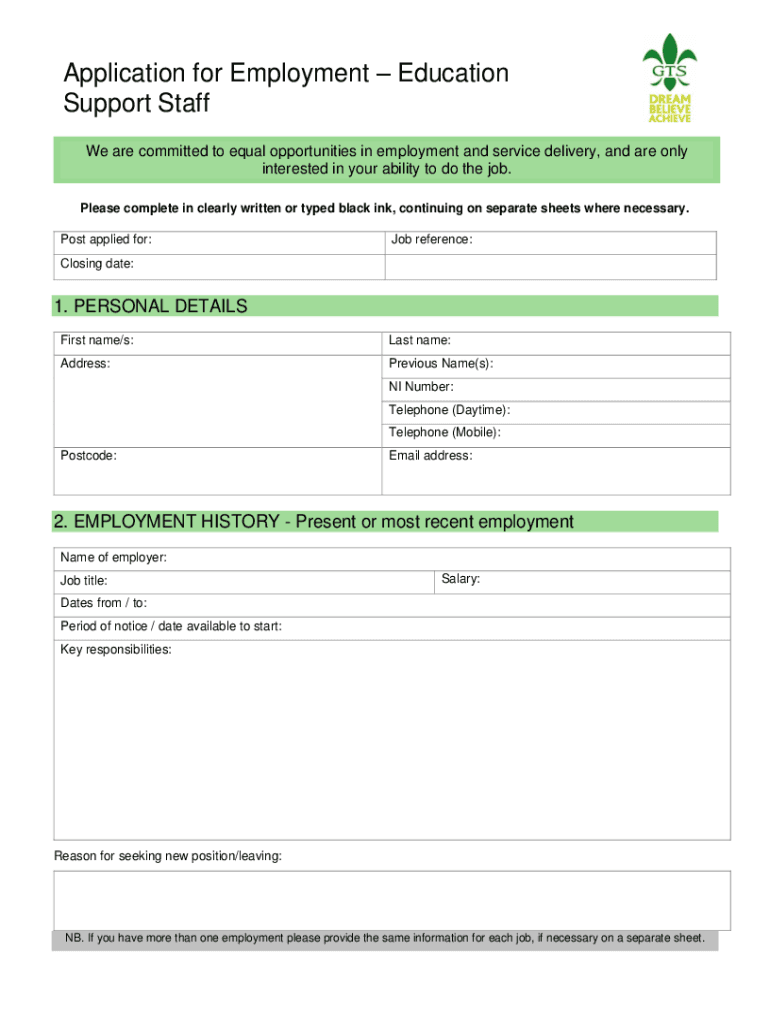 Application for Employment Education Support Staff We are committed to equal opportunities in employment and service delivery, and are only interested in your ability to do the job. Please complete